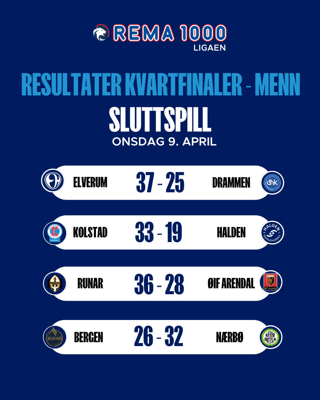Kolstad vant klart over Halden med 33–19, mens Elverum var like suverene mot Drammen og vant 37–25. Nærbø tok en solid borteseier mot Bergen og Runar fikk med seg et viktig første stikk med seier mot ØIF Arendal.