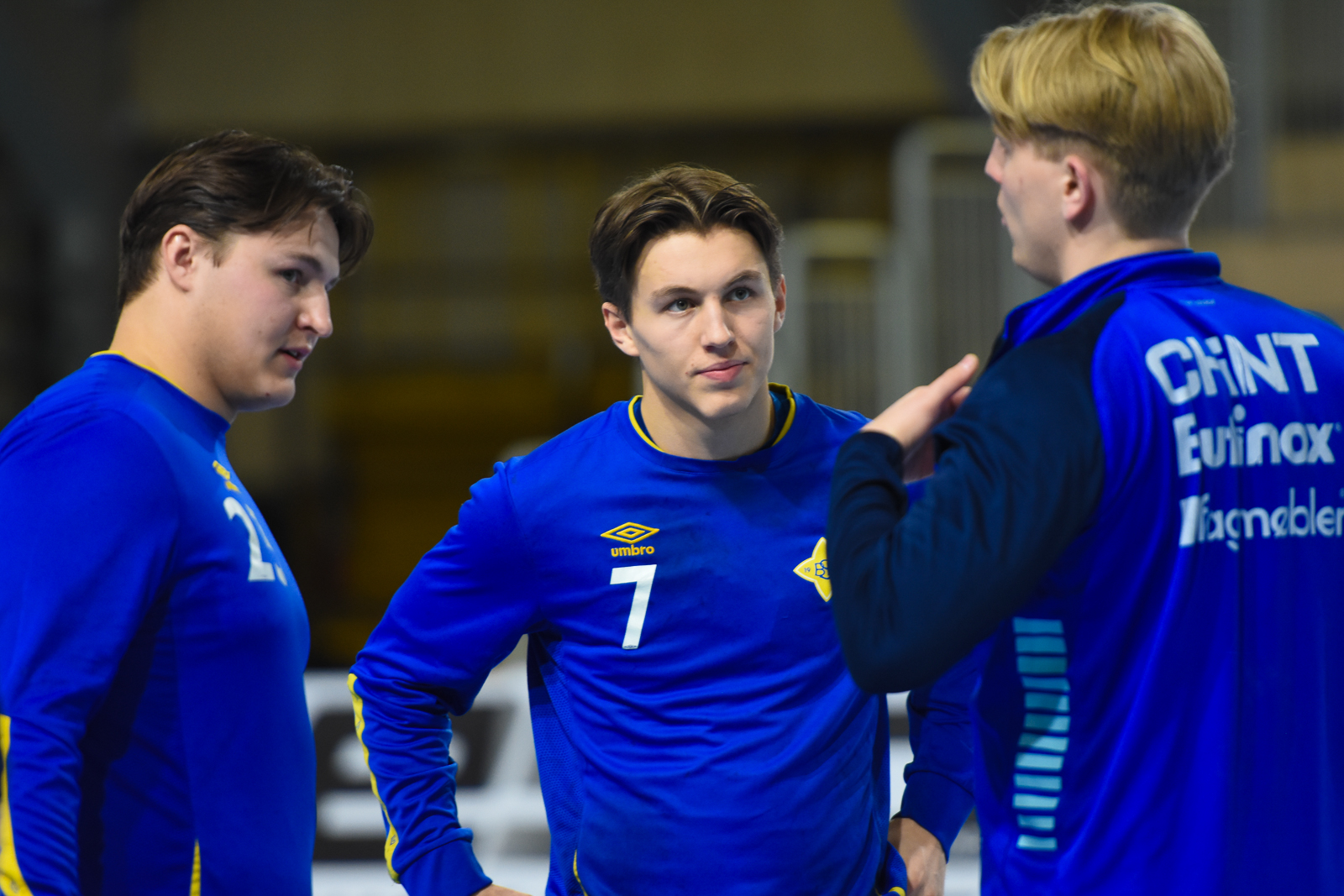 Julius (t.v.) og Jonatan Goksør Bjerkrheim hadde en kort prat med DHKs August Olsen Storbugt før kampstart søndag. August forlater DHK, mens Jonatan blir nye DHK-spiller de to neste sesongene.