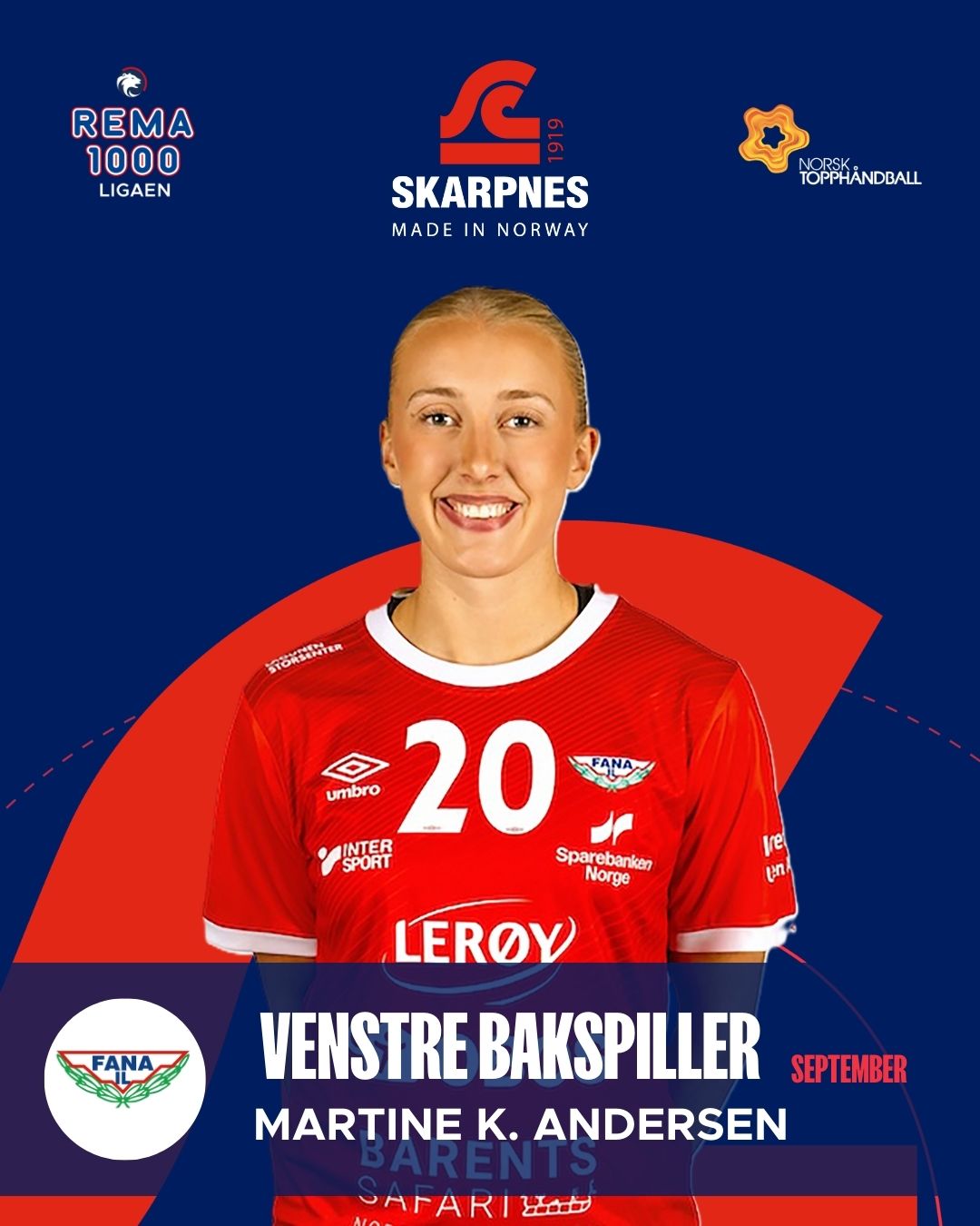 Klar toppscorer på månedens lag med 33 mål. Med 11 mål i snitt per kamp har Martine vært ustoppelig. Hun kombinerer gjennombruddskraft med skuddstyrke og har vært helt sentral for Fana.