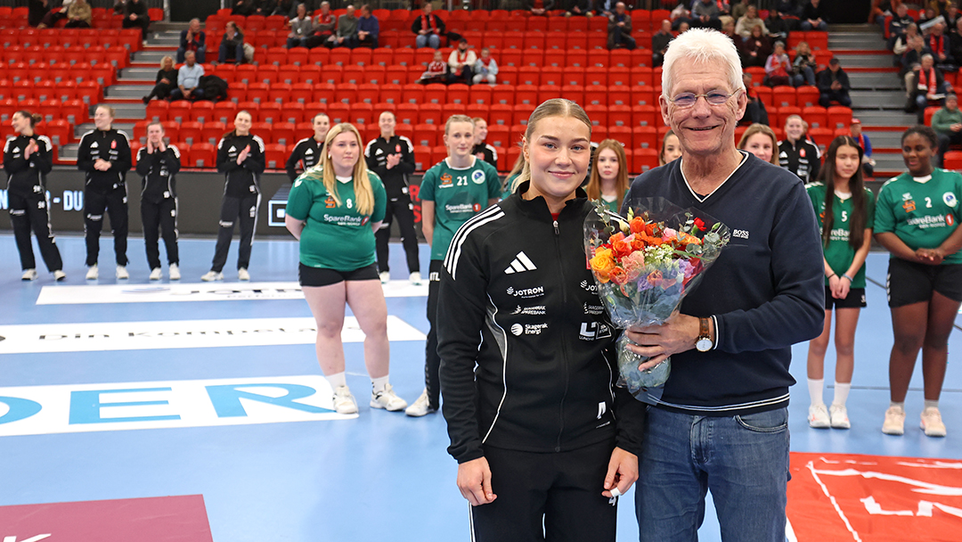 Charlotte Iversen fikk blomster før kampen. hun passerte tidligere i vinter 100 kamper i Larvik-trøya.