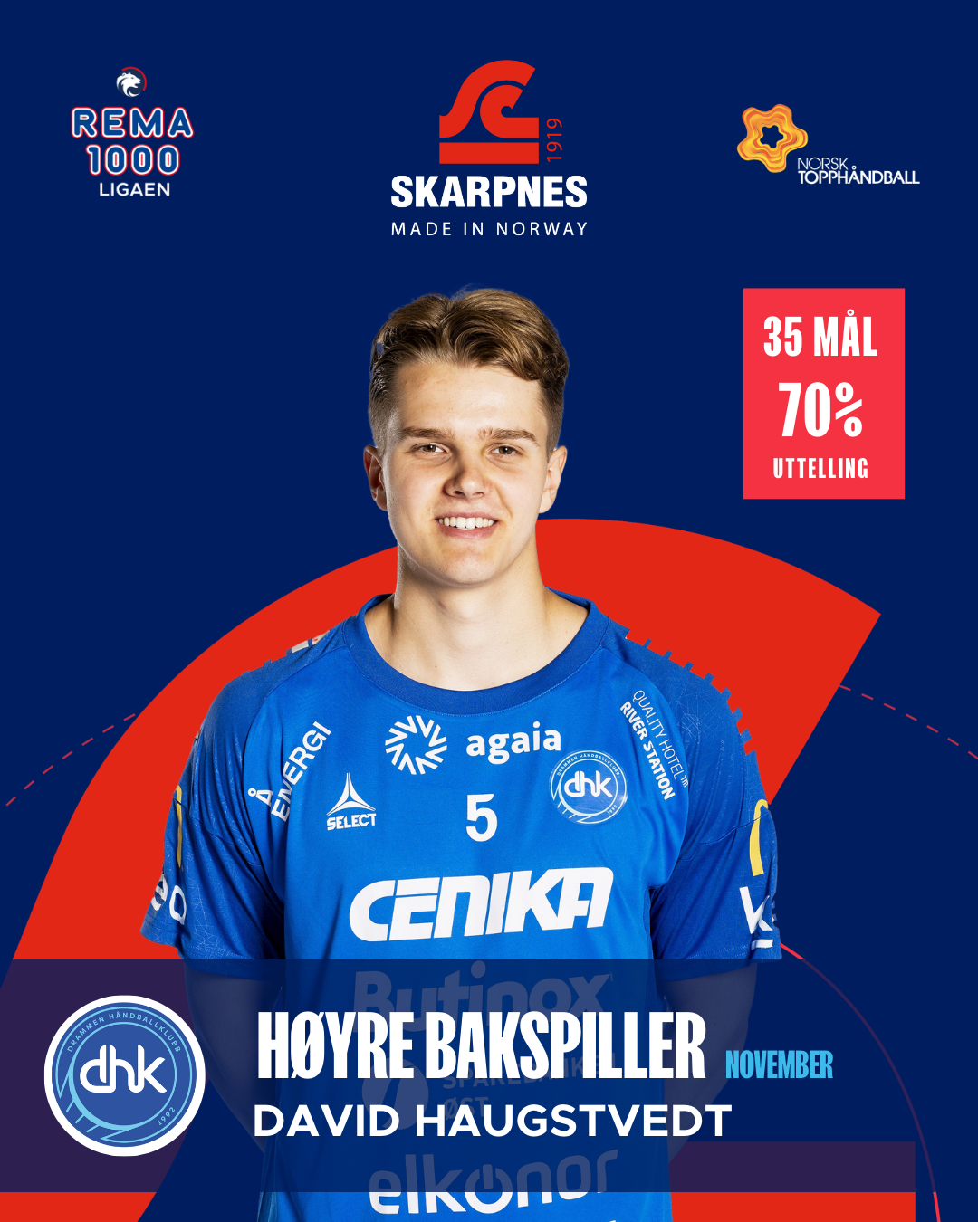 David Haugstvedt leverte en svært produktiv måned for Drammen. Med 35 mål på fire kamper – et snitt på 8,8 – og 13 assists har han vært et konstant angrepstrussel fra høyresiden. En uttellingsprosent på 70 % underbygger hvor stabilt han har prestert i avslutningene.