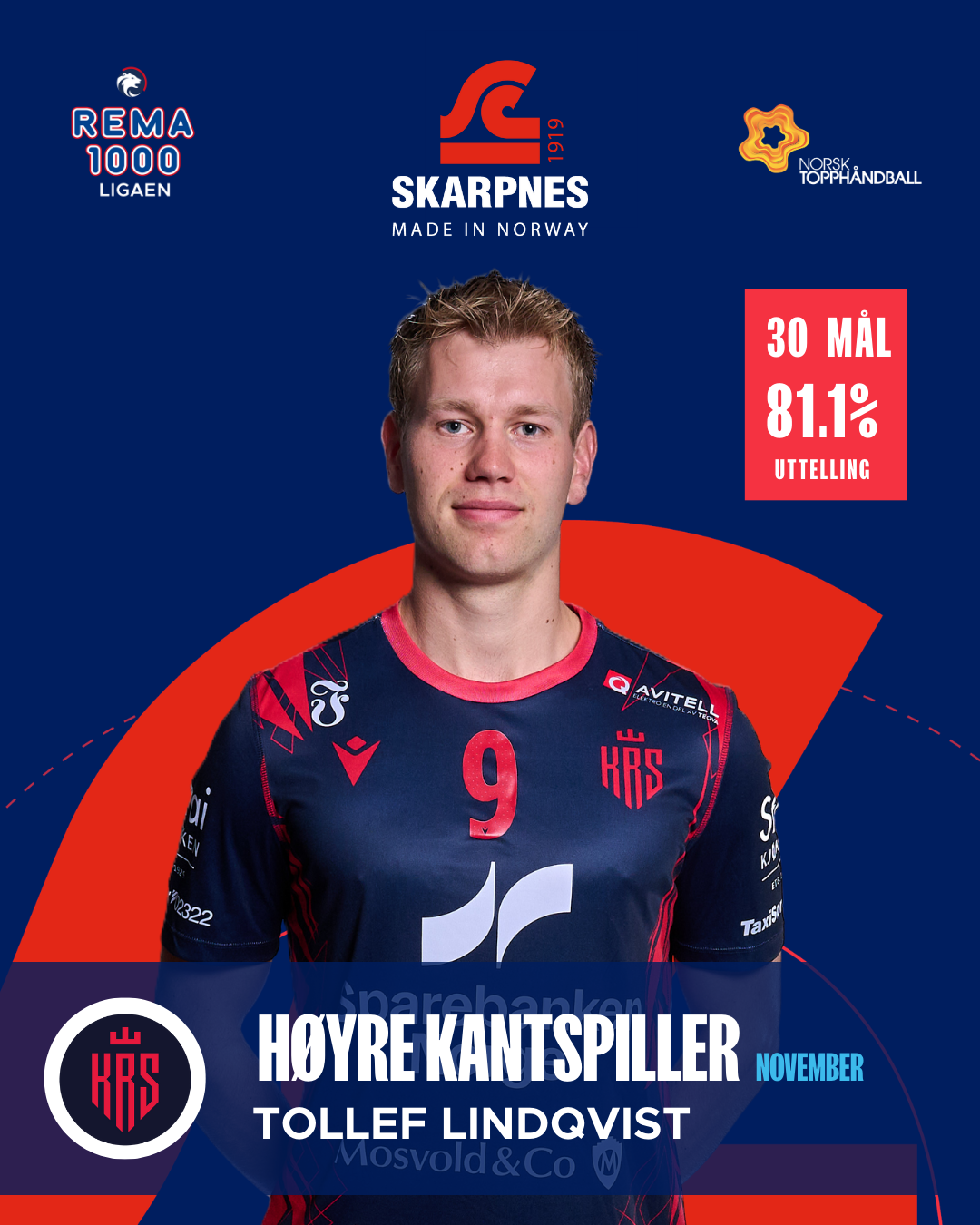 Fra høyrekanten har Tollef Oskar Lindqvist vært påliteligheten selv. 30 scoringer, en imponerende uttellingsprosent på 81,1 og stabile prestasjoner over fem kamper viser en spiller som leverer jevnt og sikkert. En viktig brikke i Kristiansands angrepsspill.